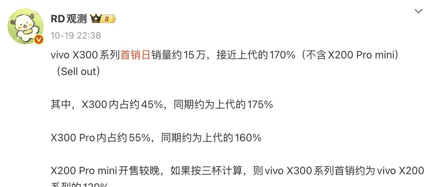 该系列首发天玑9500旗舰芯片,有X300和X300 Pro两款机型,首日销量约为15万台,接近上代机型(不含X200Pro mini)的1.7倍。其中vivo X300占比45%,通过计算可知单品销量约为6.75万台,约为上代机型的1.75倍。