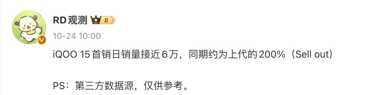 在硬件配置全面升级后,iQOO15的成绩依旧惊艳:单品首日销量接近6万台,约为上代机型的2倍,是目前销量最好的电竞旗舰。如果你经常看数据的话,应该知道iQOO13的销量其实挺不错的,在去年子品牌旗舰中遥遥领先,看来今年的成绩依旧未来可期。还有一件事,iQOO15发布即开售,首销成绩能够逼近vivo X300,其产品实力还是挺不错的。