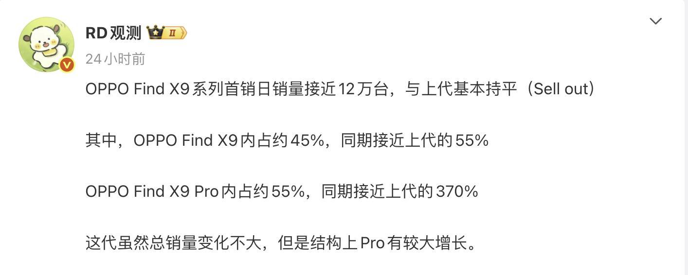 该系列包括X9和X9Pro两款机型,首日销量接近12万台,和上代机型基本上持平。其中Find X9占比45%,单品销量约为5.4万台,仅为同期上代机型的55%。比较出彩的是OPPO Find X9 Pro,它的占比为55%,单品销量约为6.6万台,同期接近上代的3.7倍。