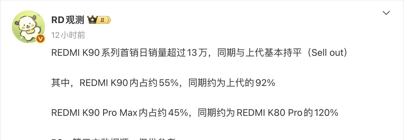 红米K90系列包括标准版和Pro Max版本,首日销量超过13万台,同期与上代基本持平。其中红米K90占比约为55%,单品销量为7.15万台,约为同期的92%。红米K90Pro Max占比约45%,单品销量约为5.85万台,同期约为红米K80Pro的1.2倍。