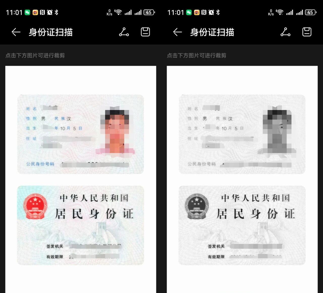 在这里选择相应的功能,就可以实现不同的身份证复印件效果,比如可以选择黑白模式、增强模式或者原图。
