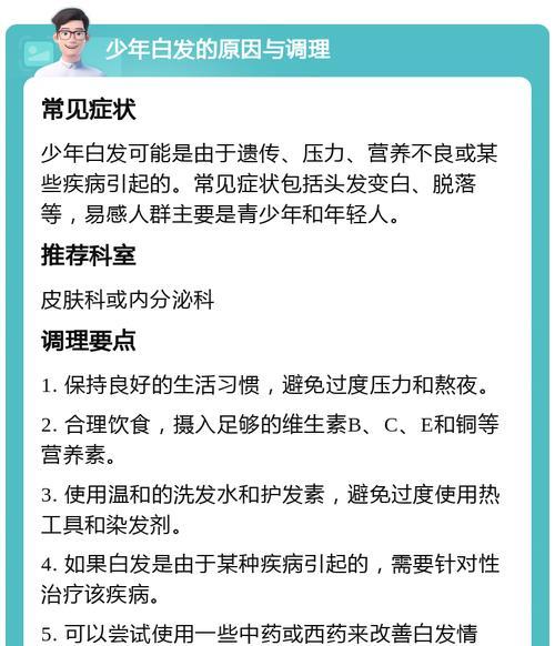 少年白是现代社会中的一个比较常见的现象,一些人一到二十岁就开始出现白发,这给他们的生活带来了许多困扰和不便。针对这种情况,本文将提供一些方法和技巧,帮助读者恢复健康黑发,让他们告别少年白的烦恼。