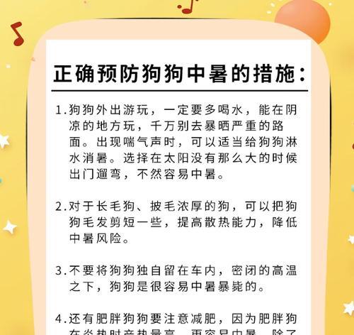 狗狗是人类最好的朋友,但是在炎热的夏季,狗狗很容易因为中暑而受伤。作为主人我们应该了解如何预防和处理狗狗中暑的情况。下面将介绍一些实用的方法来帮助我们避免狗狗中暑。
