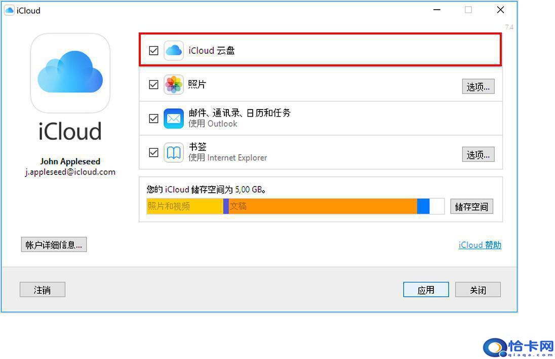开启 iCloud 后,选择好你要使用的服务并点击“应用”。举例来说,如果打开了“iCloud 照片”和“iCloud 云盘”,Windows 版 iCloud 便会在文件资源管理器中创建新的文件夹来放置这些文件。