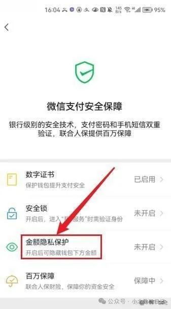 4、进入微信支付安全保障界面,针对“金额隐私保护”,点击开启之后,可以隐藏钱包下方的金额。此时零钱通余额就被隐藏起来了,别人无法查看你的余额。