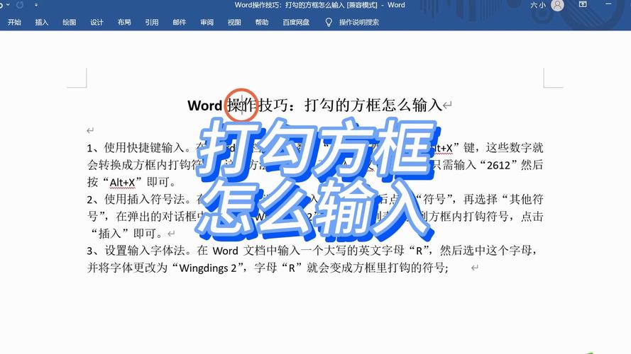Word或Excel文件:这些办公软件支持插入符号,在Word中,转到“插入”选项卡,选择“符号”>“更多符号”,找到对勾字符(常用代码为U+2713),点击插入,调整大小和位置,确保在方框内,Excel类似,但更适合表格清单:先插入复选框(通过“开发工具”选项卡),然后勾选它,如果方框是手动绘制的,直接输入对勾符号,快捷键如Alt+0252(数字键盘输入)能加快速度,实践中,我推荐为常用文档创建模板,预设好复选框,省去重复操作。