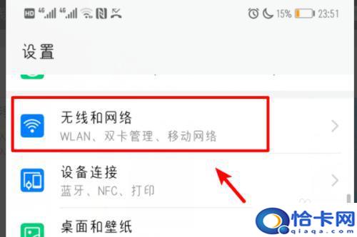 2.进入设置列表后,点击无线和网络的选项进入。