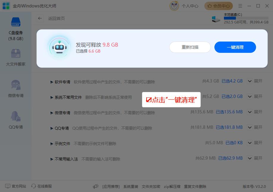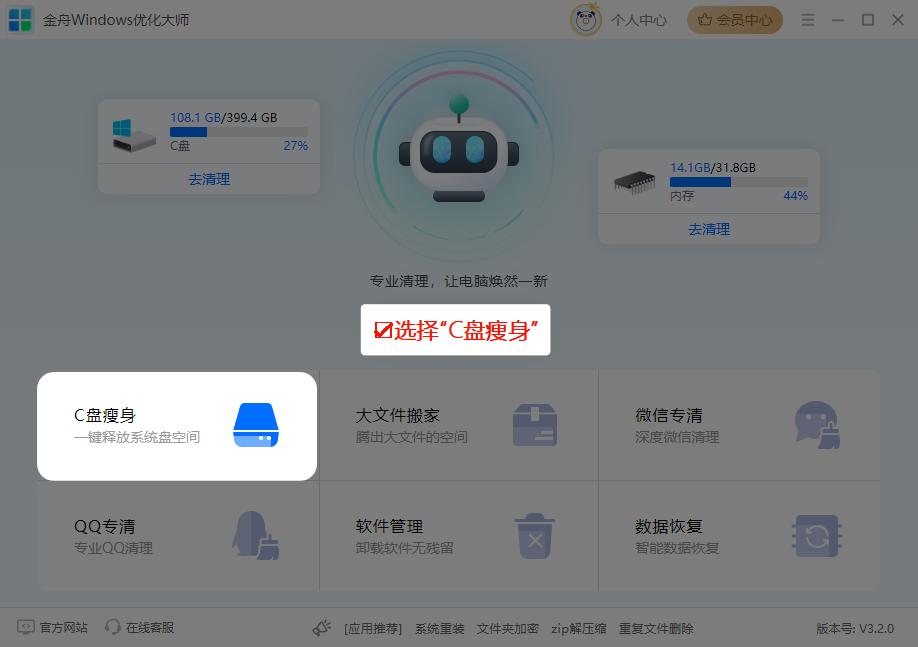 🔹Step1:官网下载绿色正版的«金舟Windows优化大师»,安转允许软件,主界面选择«C盘瘦身»。