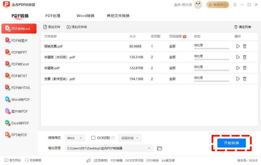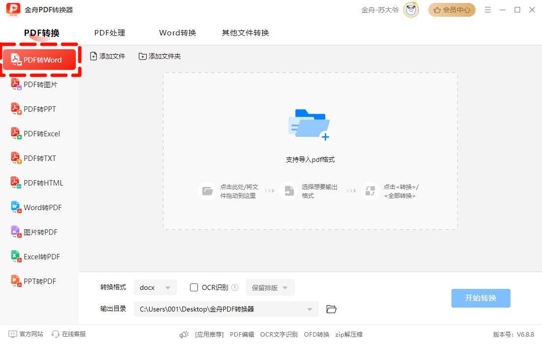 打开金舟PDF转换器,选择“PDF转换”中的“PDF转word”功能。
