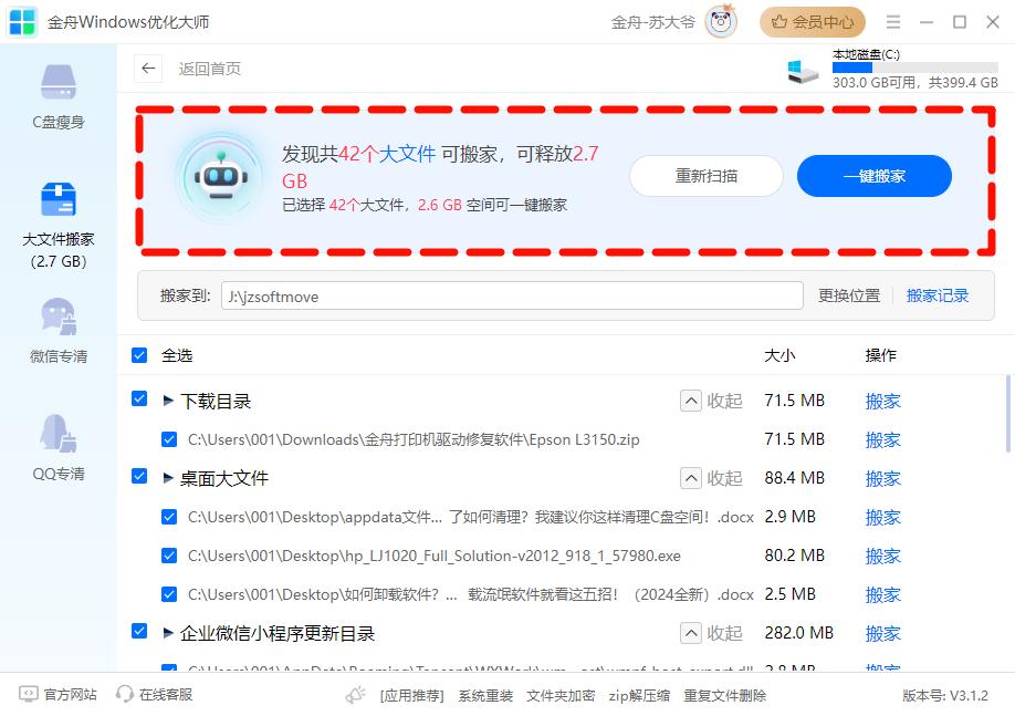 金舟Windows优化大师是一款致力于通过清理C盘内存垃圾来提高电脑运行性能的软件,其“大文件搬家”功能可以快速定位C盘中占用空间的大文件并一键搬家。
