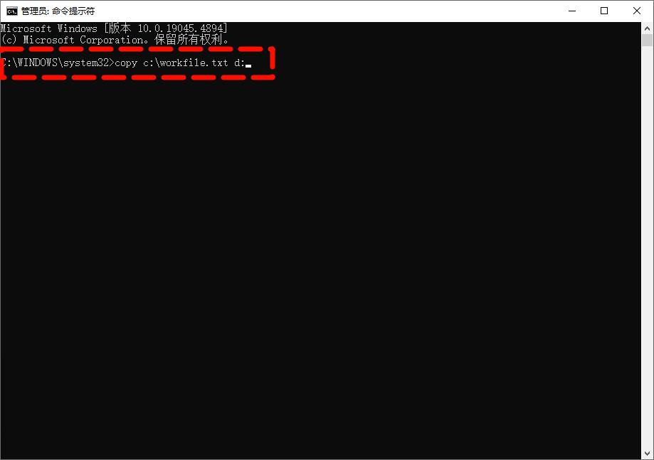 ● 运行命令:在命令窗口中运行命令,如copy c:\workfile.txt d:,即可将C盘根目录下的workfile.txt文件复制到D盘。