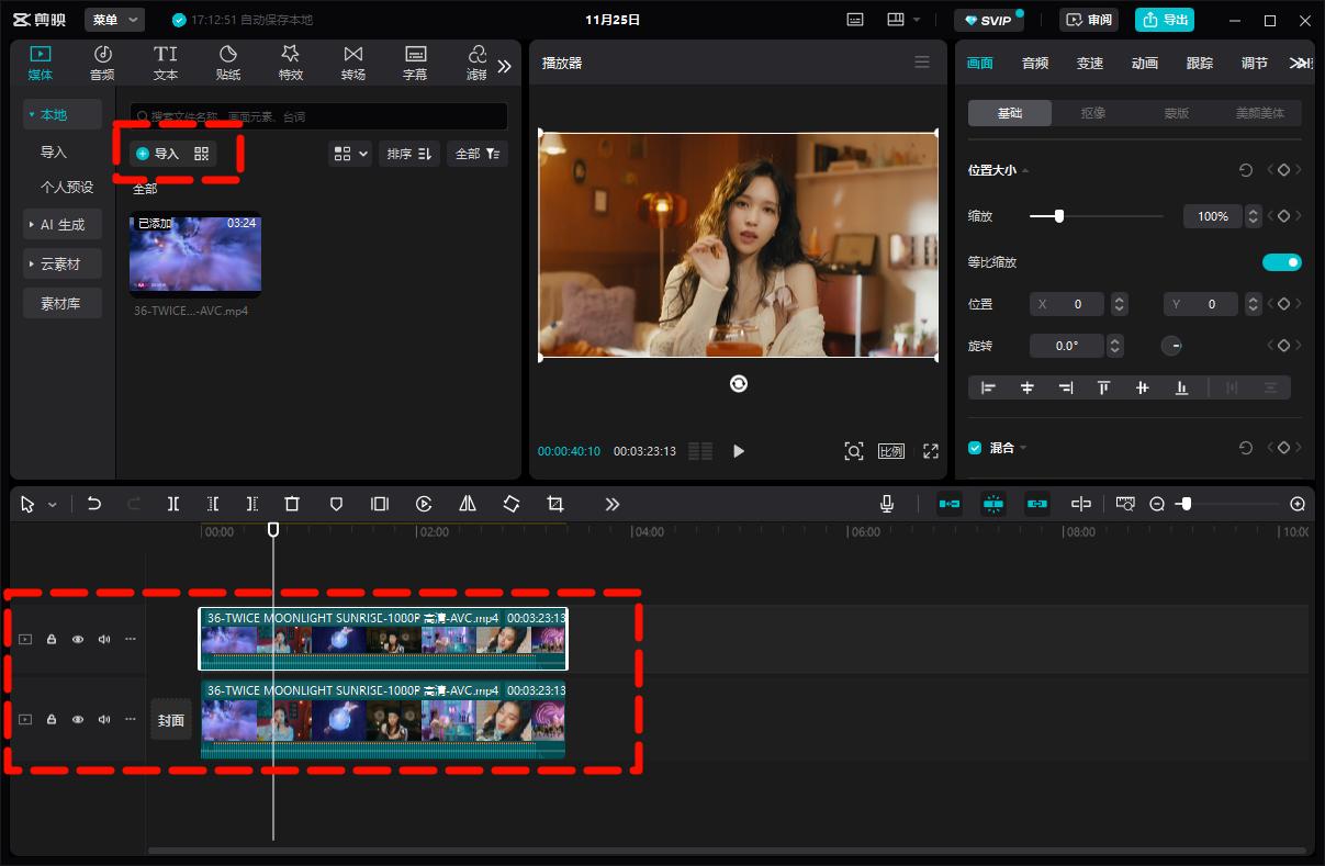 将视频导入剪映后,复制一份并拖到原视频上方的轨道。
