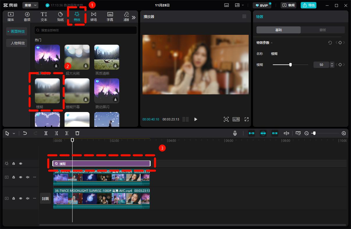在【特效】面板中找到【模糊】特效,拖动特效长度使其与视频长度一致。