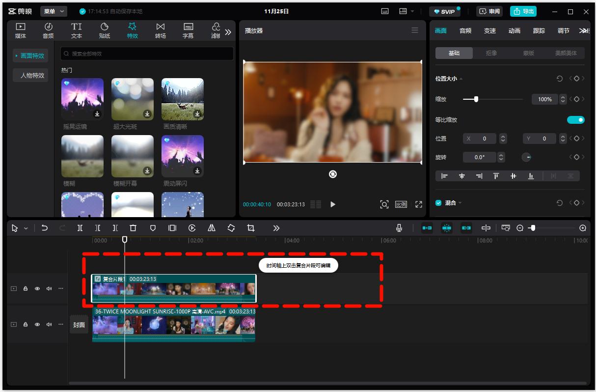 选中上面轨道的视频和特效,用快捷键【Alt+G】将它们合并。