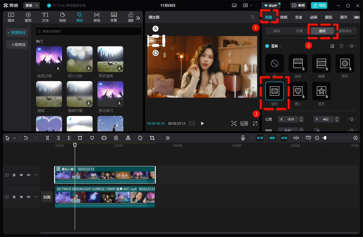 在【画面】菜单栏选择【蒙版】-【矩形】,调整矩形框大小以覆盖水印。
