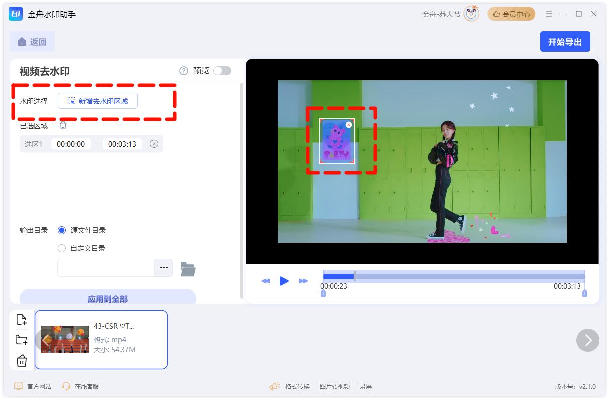 点击【水印选择】-【添加去水印区域】,选择并调整水印区域。
