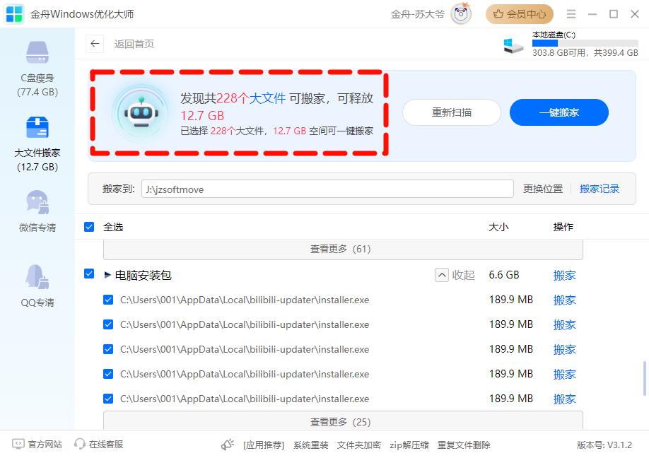 如果你觉得手动清理太过繁琐,或者想要更深入地清理系统垃圾,可以考虑使用第三方电脑C盘清理软件,如金舟Windows优化大师等。这些软件通常具有智能识别功能,能够避免误删系统文件。