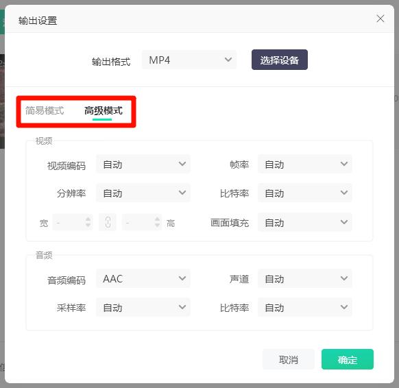 m4s转mp4-视频格式转换第三步、视频添加成功后,点击【输出信息】或者【设置按钮】进行视频文件信息的设置。这里我们默认选择【mp4】格式,以及其他的视频参数,简易模式下可以设置视频的清晰度、分辨率、画面质量;高级模式可以调整视频更详细的参数,例如视频编码、帧率、音频采样率、比特率等。