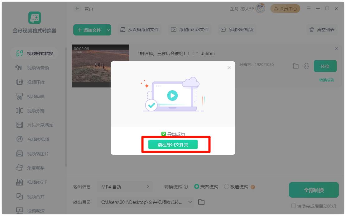 m4s转mp4-视频格式转换转换视频格式完成后,软件会弹出相应的提示窗口,我们可以点击【前往导出文件夹】进行第一时间的视频播放检查。