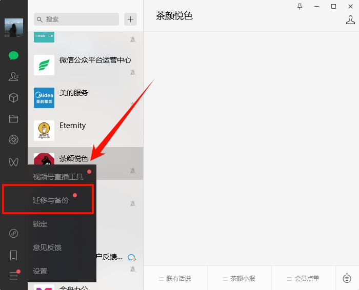 Step1:打开微信,点击“我”->“迁移与备份”(电脑最新版微信)。