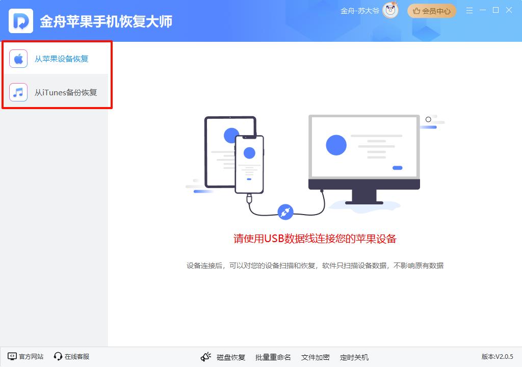 Step1:从正规途径下载安装金舟苹果手机恢复大师,完成安装步骤后,双击软件的快捷图标,运行进入软件主页面,可以清楚地看到【从苹果设备恢复】【从iTunes备份恢复】这两个功能选项。