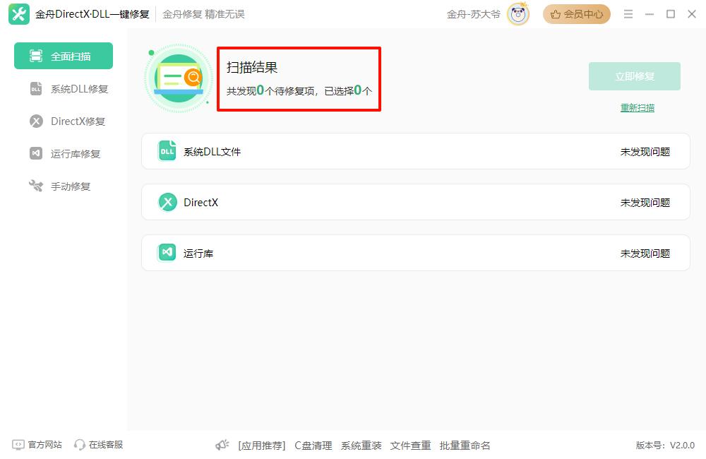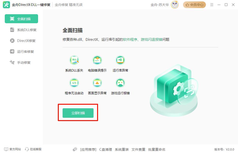 运行工具:打开下载的【金舟DirectX·DLL一键修复】,选择“全面扫描”选项。