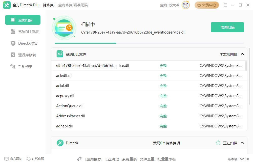 win7一键修复所有dll缺失自动修复:金舟DirectX·DLL一键修复将自动检测并列出所有缺失或损坏的DLL文件,用户只需点击“修复”按钮,工具便会自动下载并安装正确的DLL文件。