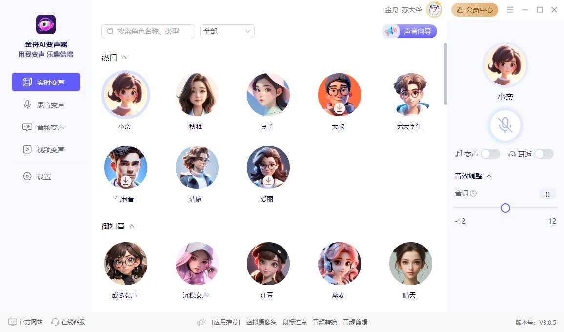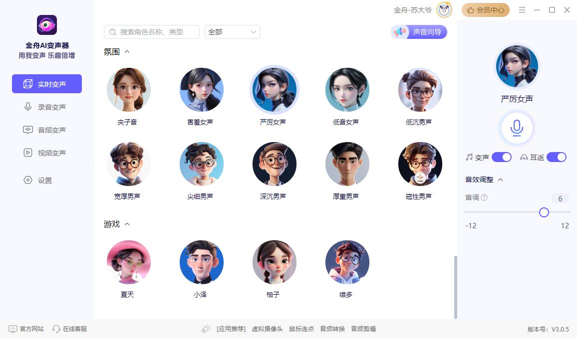 步骤1.打开金舟AI变声器:在这里,你可以看到多种预设的变声效果,如男声、女声、游戏声、氛围声等。根据需求,选择合适的变声效果。