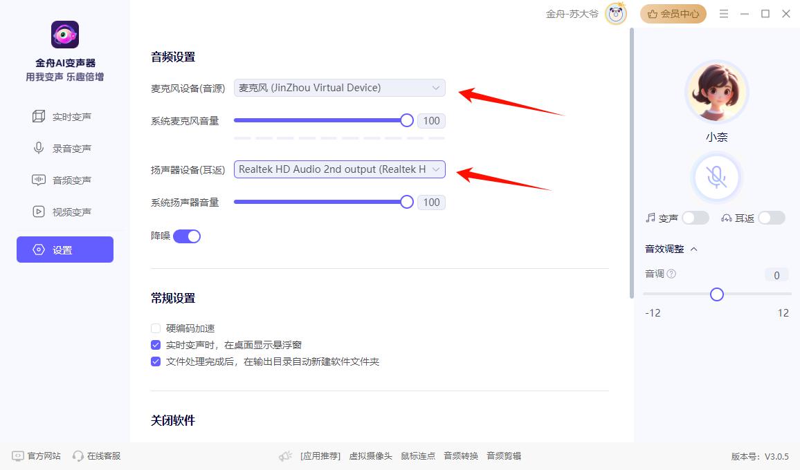 电脑变声器开麦就变声步骤2.设置金舟AI变声器的默认输入输出设备:软件里设置本身的扬声器和麦克风。
