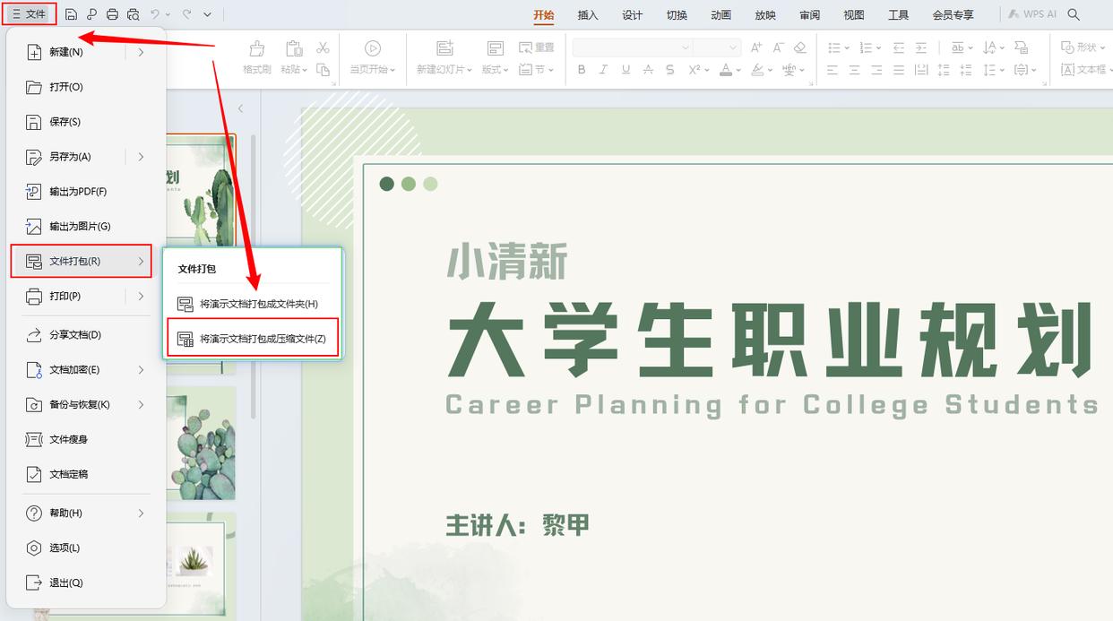 步骤1:ppt文件默认使用wps或Microsoft Office打开,菜单栏中选择“文件”->“文件打包”->“将演示文档打包为压缩文件”。