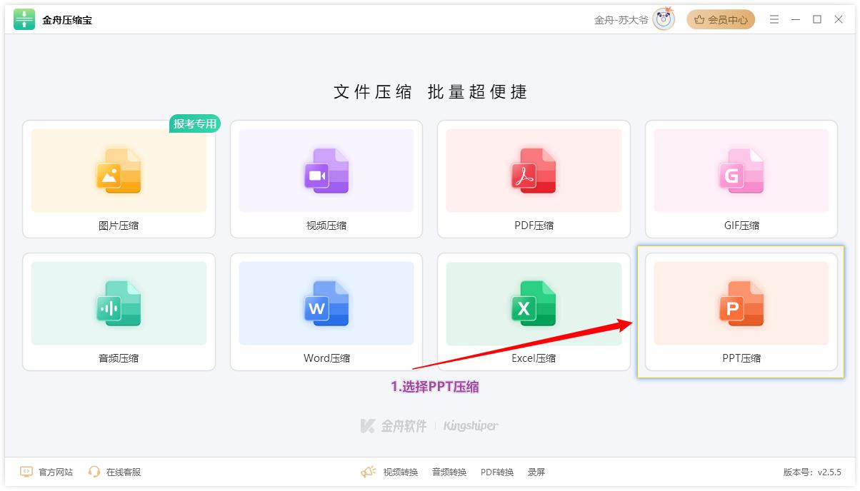 操作步骤1:官网安装纯净的金舟压缩宝,运行软件后主页面选择点击「PPT压缩」区域。