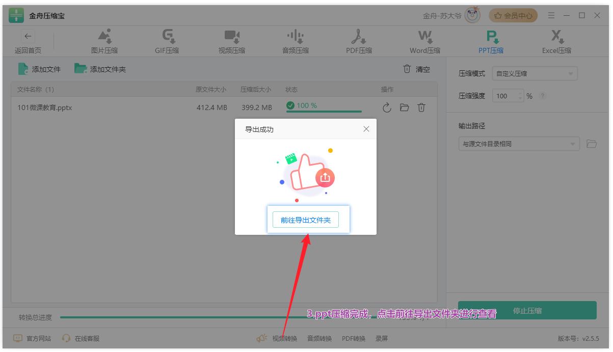 软件介绍:金舟压缩宝采用了电脑最先进的文档媒体压缩技术,支持图片、视频、PDF、PPT、Word等多种文件格式进行压缩,可以手动设置压缩大小比例和清晰度,其压缩率高且能保证压缩后的文件画质清晰,操作简单易上手,非常值得推荐给日常经常需要进行文件压缩的打工人。
