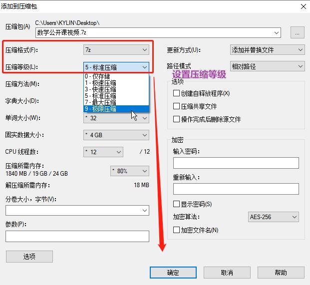 操作步骤2:设置压缩是否加密,压缩格式,选择压缩强度。