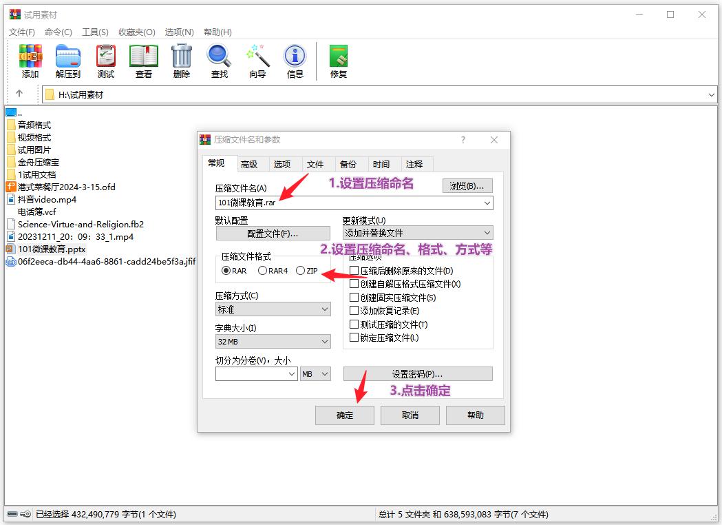 操作步骤2:点击「添加到压缩文件」,设置压缩名字、格式、方式、是否密码。