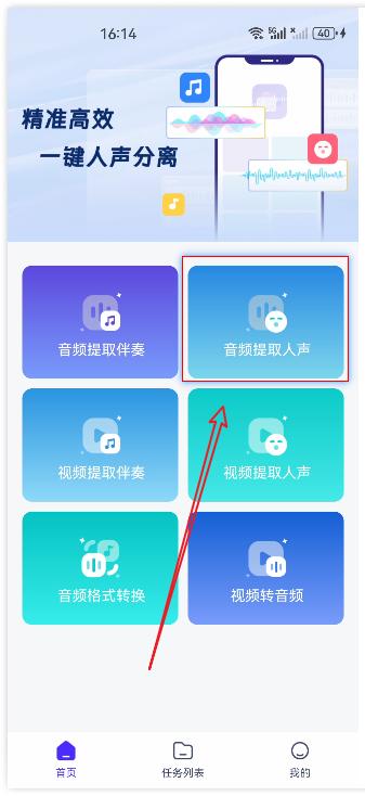 步骤1:安装运行金舟音频人声分离APP,进入软件页面之后点击【音频提取人声】。