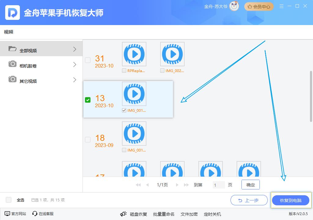 步骤4:扫描结束后,选择需要恢复的视频,点击“恢复到电脑”。