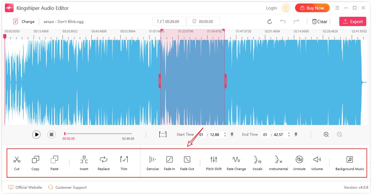 Kingshiper Audio Editor是一款基础入门音频剪辑功能,提供常见的音频处理选择,包括剪切、合并、降噪、添加效果等,导出音频支持转换格式和音频参数。
