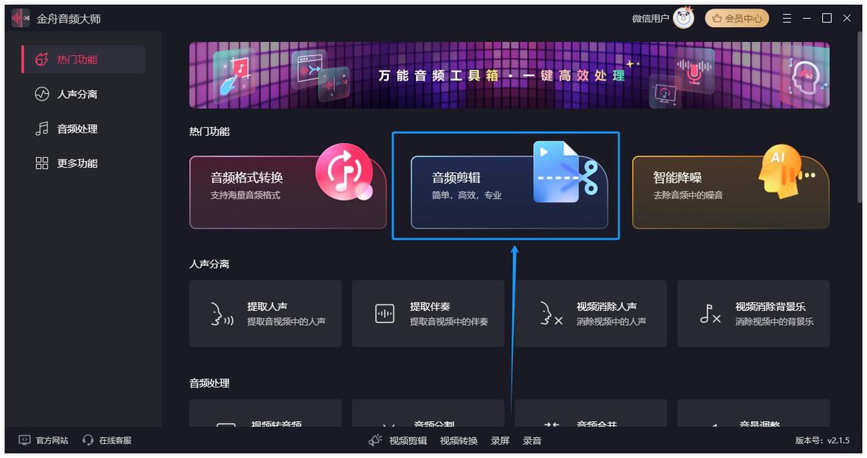 步骤1.金舟音频大师点击“音频剪辑”功能。