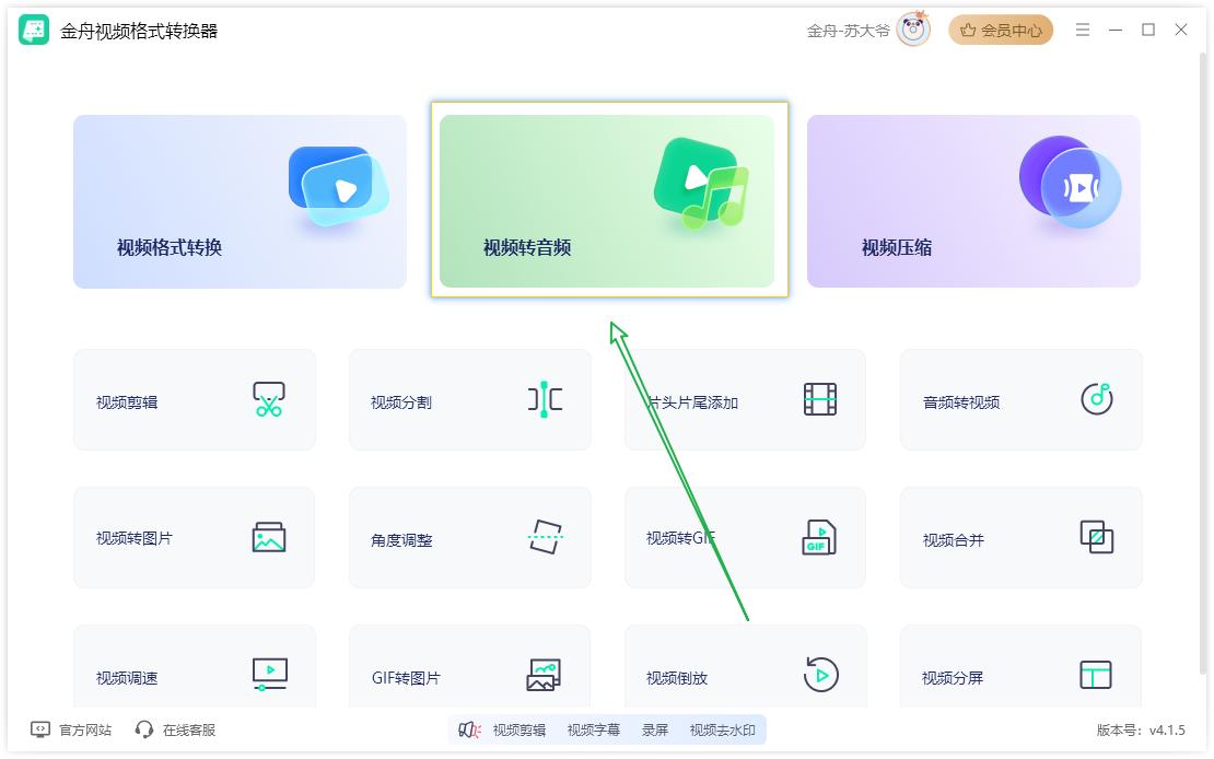 步骤1:金舟视频格式转换器页面点击【视频转音频】功能。