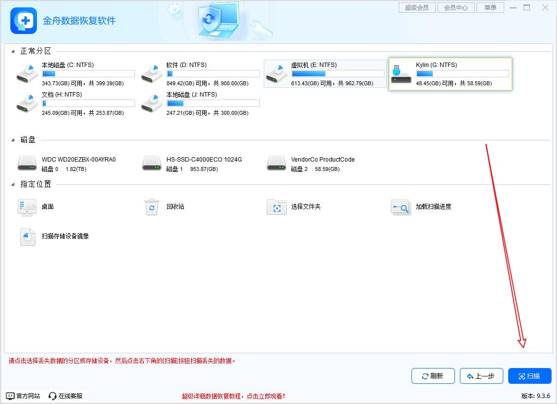 Step2:选择想要扫描恢复的U盘符号,例如【(G:NTFS)】,点击【扫描】。