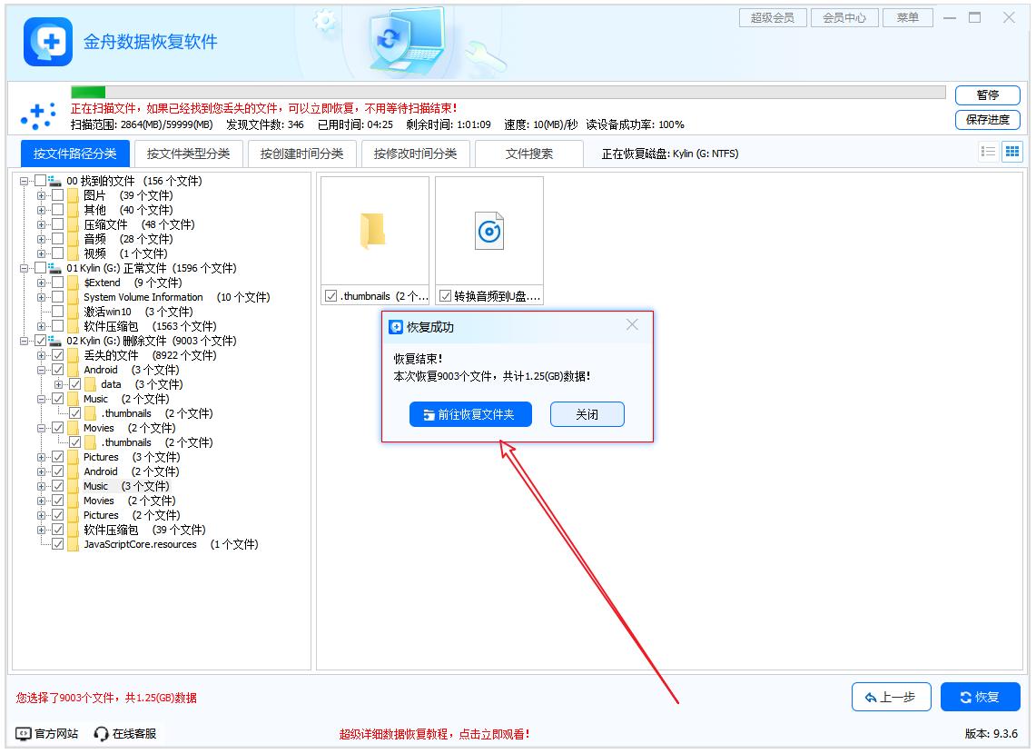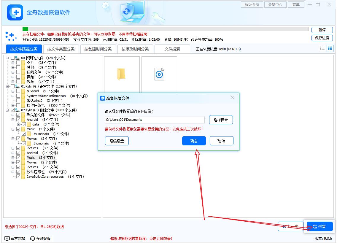 Step4:点击【恢复】,选择恢复文件保存的电脑路径,点击【确定】。