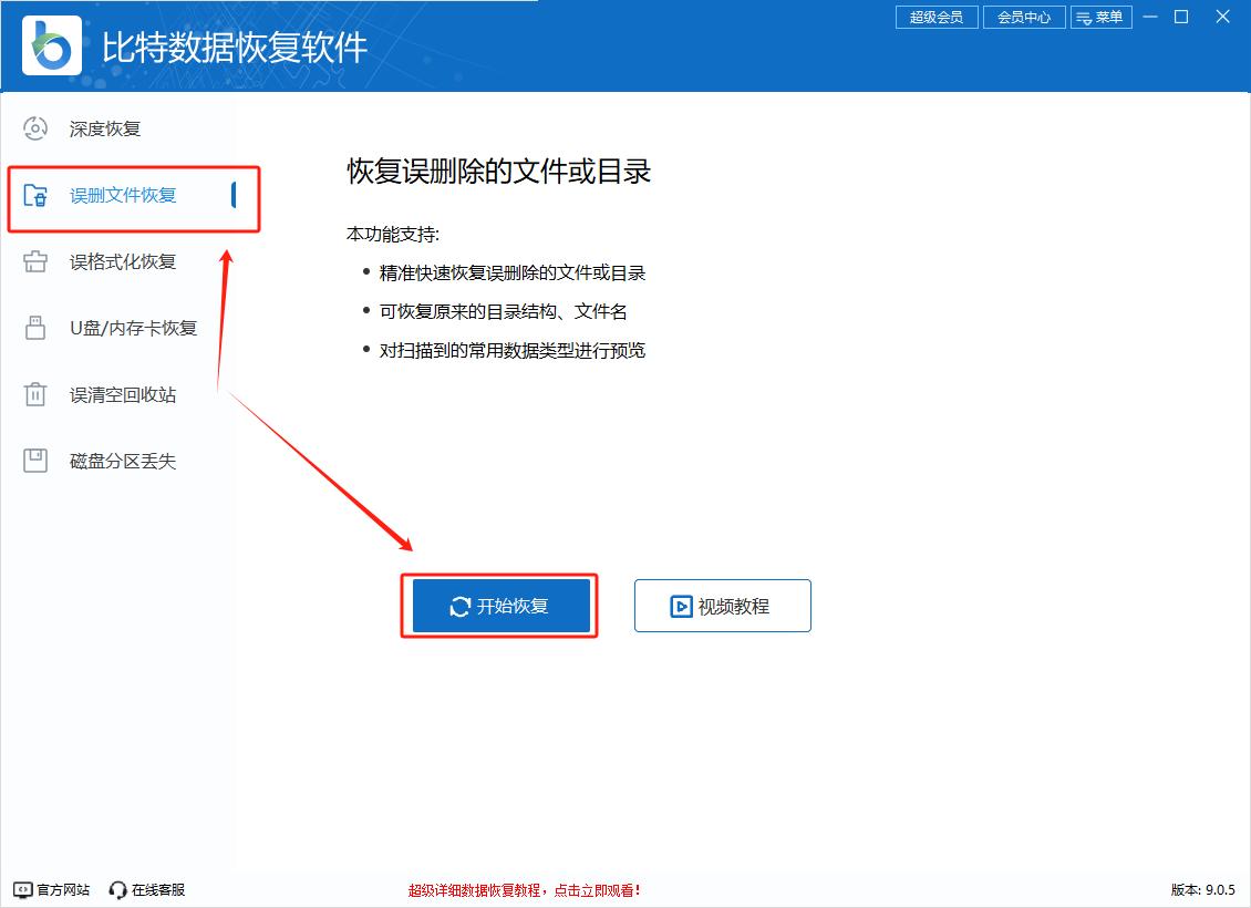 Step1:运行电脑的比特数据恢复软件,点击【误删文件恢复】,点击【开始恢复】。