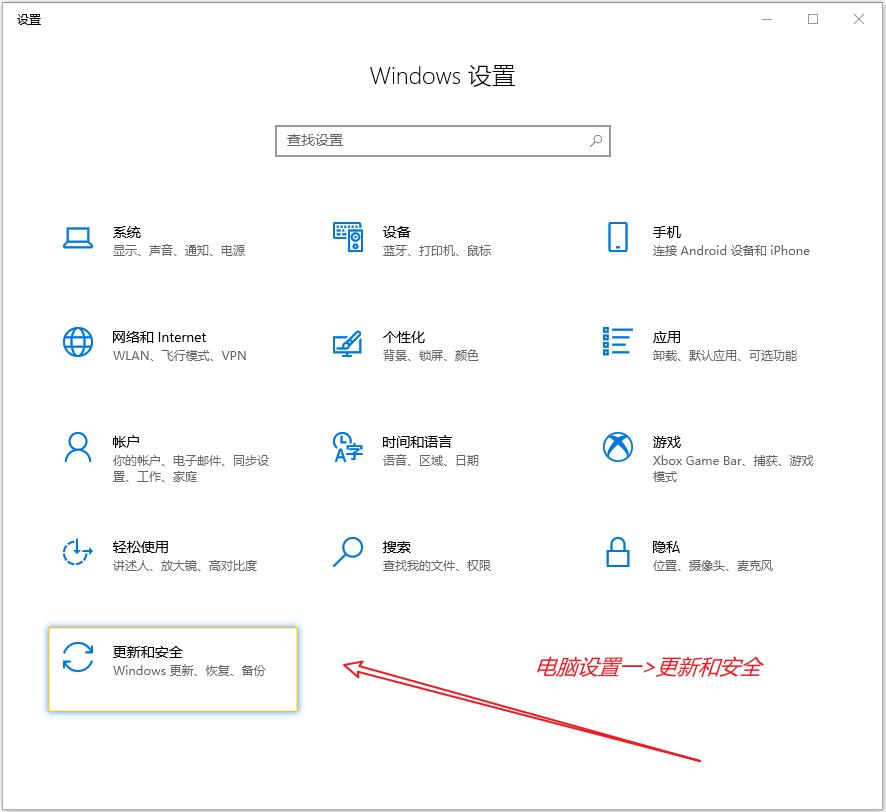 步骤1:打开“设置”应用,点击“更新和安全”。