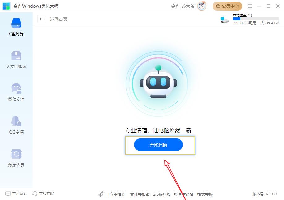 步骤1:点击电脑桌面的金舟Windows优化大师,选择“C盘瘦身”功能。