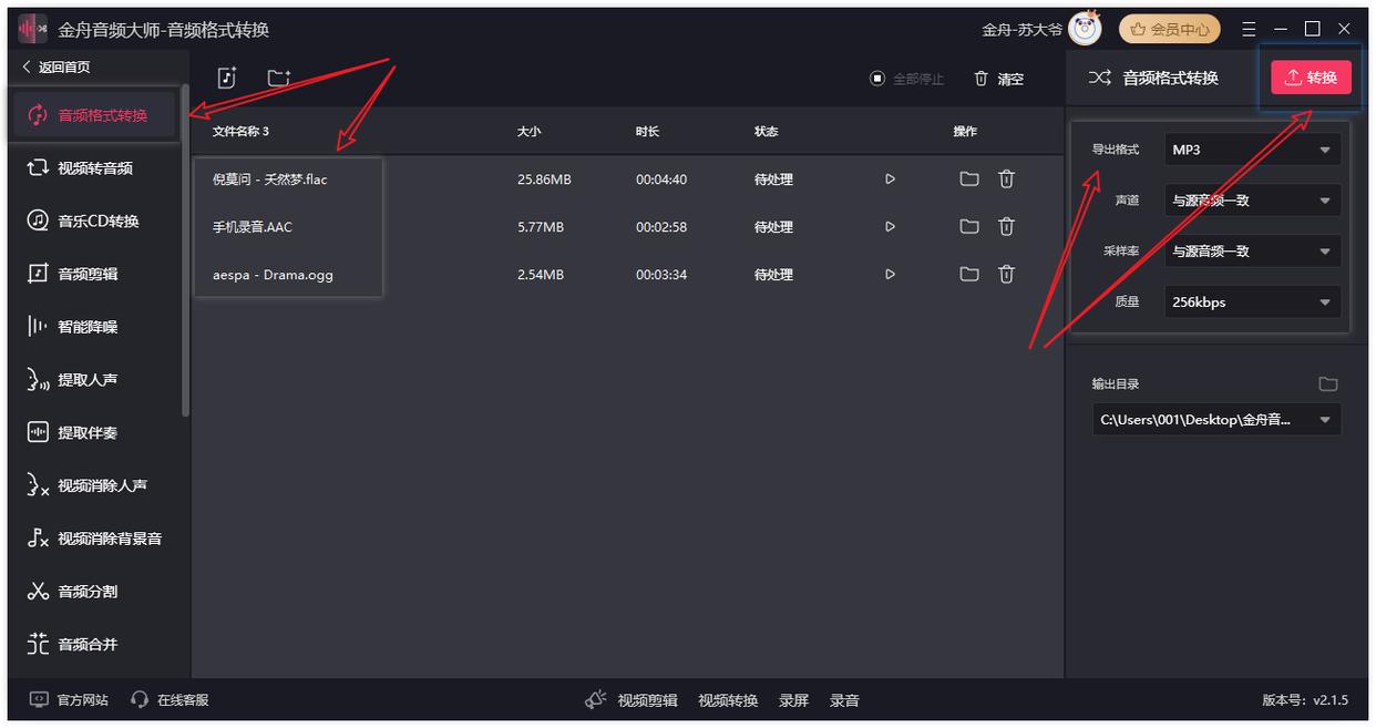 步骤1、金舟音频大师点击“音频格式转换”功能。