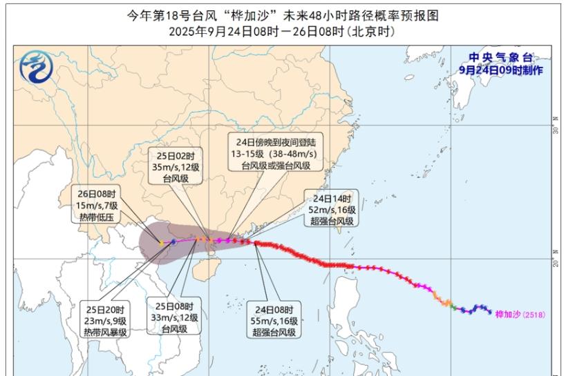 目前它以西行为主,贴着我国广东、广西沿海前进,预计今天傍晚到晚上,桦加沙将以台风或者是强台风的级别在广东台山到湛江一带沿海登陆。