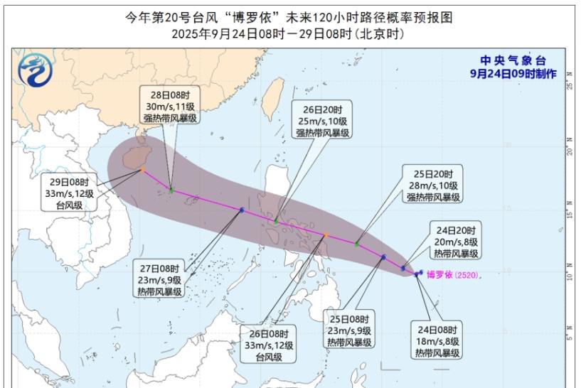 20号台风博罗依,今天8点位于距离菲律宾马尼拉东偏南方向约1390公里洋面上,中心最大风力8级,为热带风暴级,未来最强可达12级,它将以每小时10-15公里的速度向偏西方向移动,逐渐向菲律宾东部沿海靠近,于27日进入南海东部海域,29日将擦过或登陆海南,由于时效较远,路径和强度还有变化,我们继续关注。