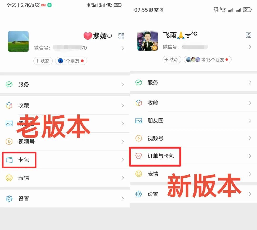 其中,券卡票证的选项对应发老版本中的卡包功能。