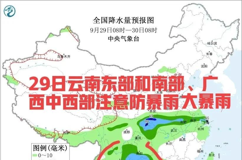 四川东北部、重庆北部、湖北北部、陕西南部、河南南部、安徽西部、江苏南部、贵州南部、云南东部和南部、广西中西部、海南岛南部部分地区出现大到暴雨。广西西南部、云南东南部局地大暴雨100~160毫米。