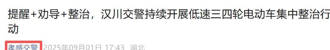 近期,湖北孝感正集中整治低速三、四轮车各类违法行为,规定,无号牌、无驾驶证、无机动车交强险的三轮、四轮低速电动车一律禁止上道路行驶。重点整治未登记号牌(安防牌不是机动车号牌)或未取得相应驾驶证驾驶三轮、四轮低速电动车,以及违法载人,非法改装、闯红灯、逆行等交通违法行为。